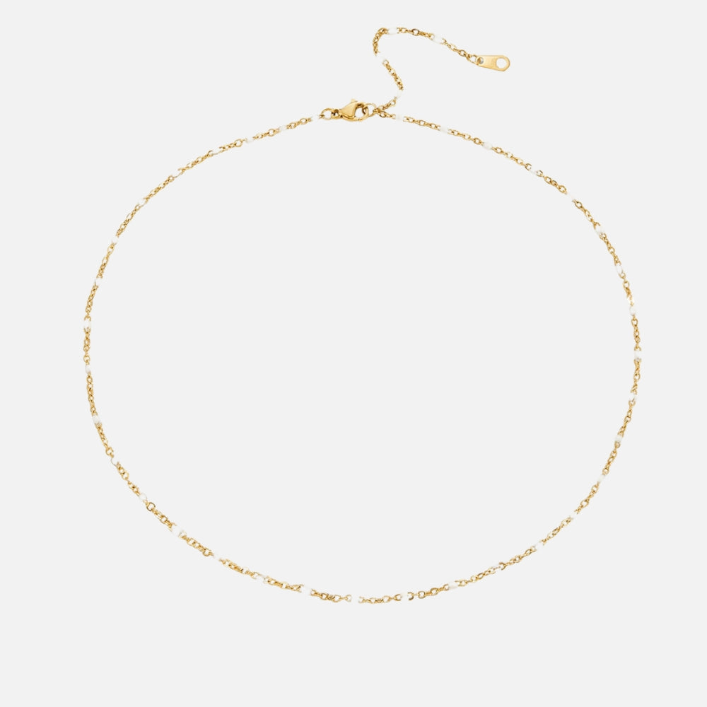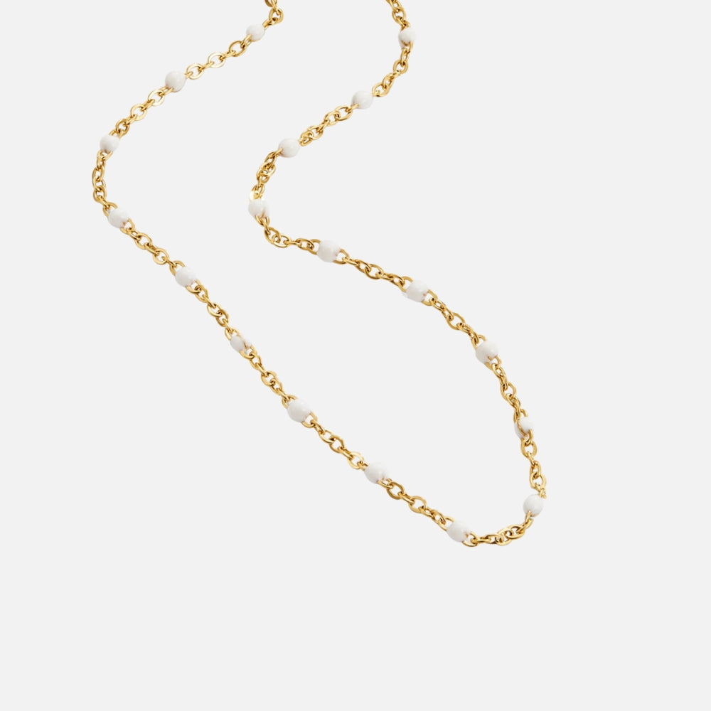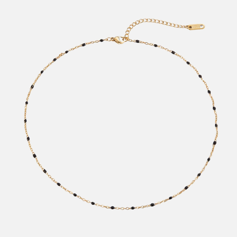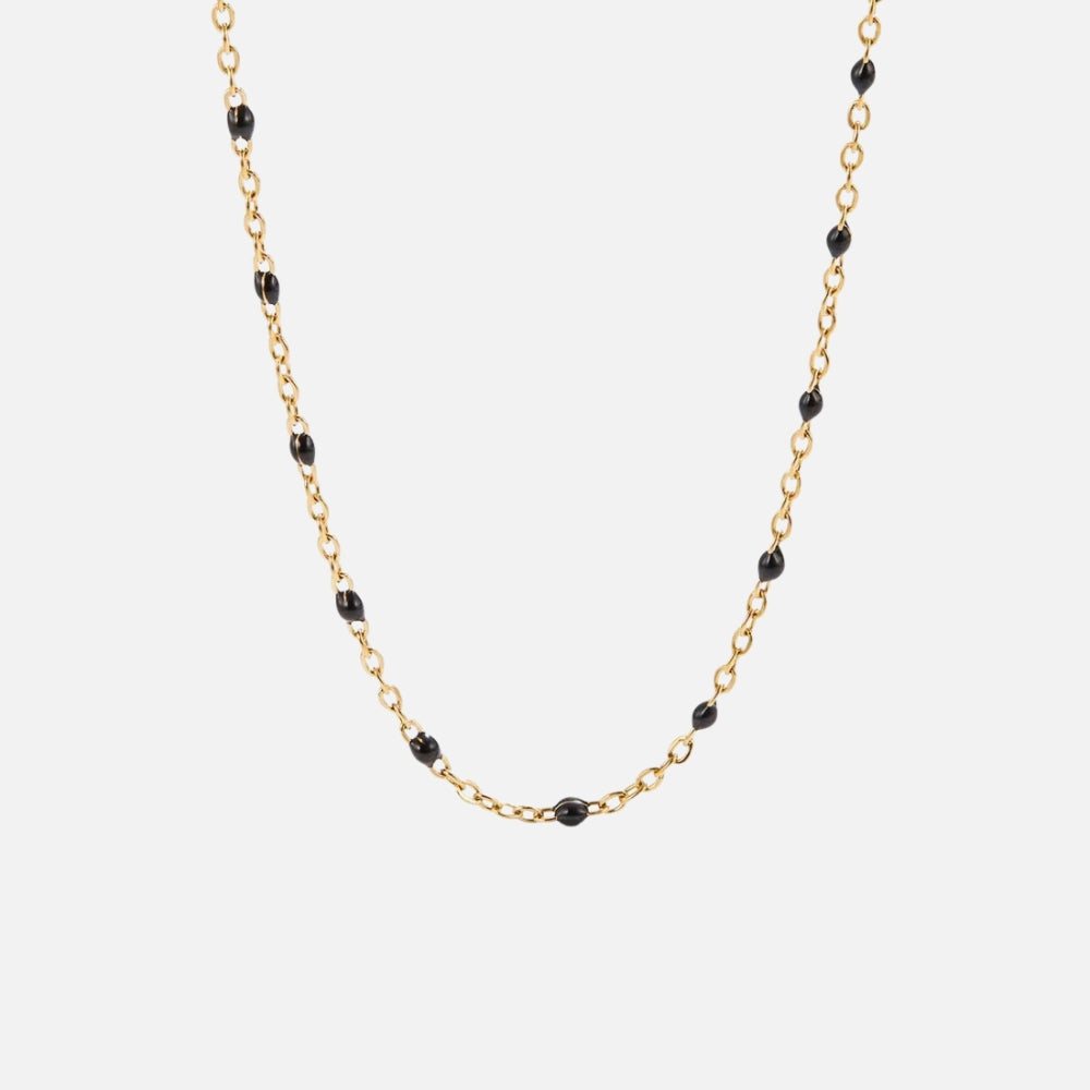 Add a touch of sophistication to your everyday style with this stunning bead necklace. Chic and versatile, it’s the perfect piece to wear on its own for a minimalist look or layered with your favorites for extra charm. Crafted from waterproof stainless steel and finished with 18K gold plating, it’s made to shine without fading or tarnishing.